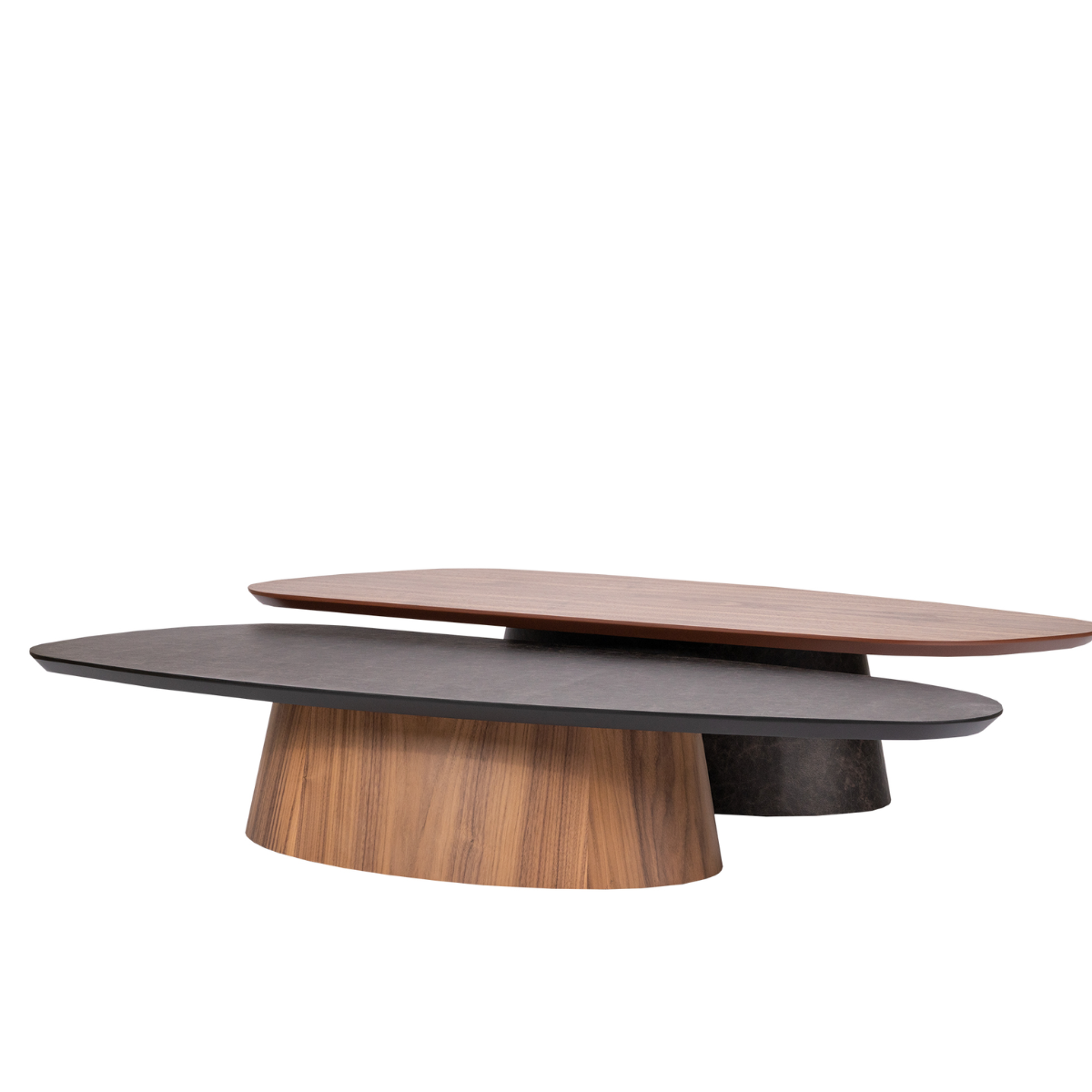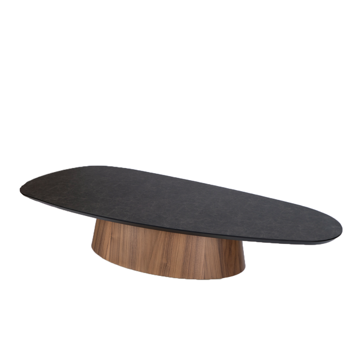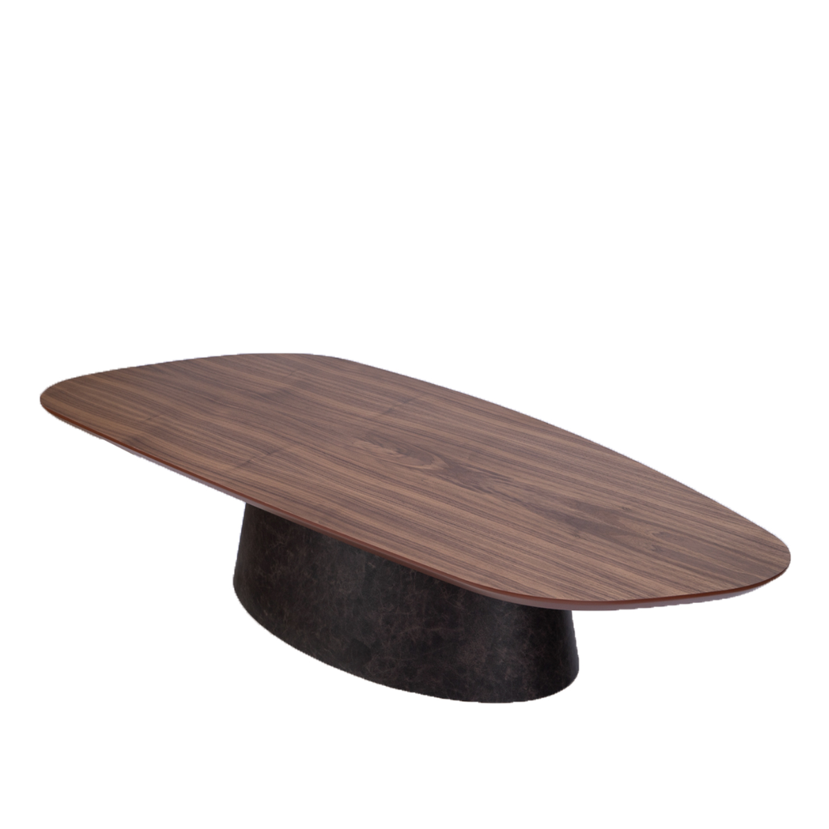 Tampo em formato orgânico, em lamina de madeira natural, recouro ou resinwood. Estrutura em recouro ou laminada.